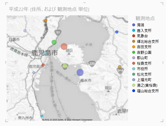 - 下記のデータは「鹿児島市の観測地点別降灰量の推移(H19〜H23)」から引用しました。(2015/9/9 リンク先が削除されていましたのでリンクを解除しました。)