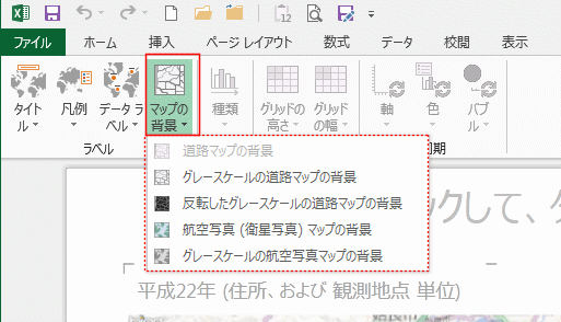 - [レイアウト]タブの[マップの背景]をクリックするとマップの背景を選択することができます。