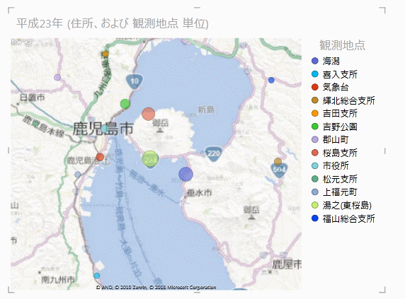 - 上記の例では鹿児島市の降灰データを使っていましたので、スケールが小さい?ので、日本地図をベースにしてみます。
