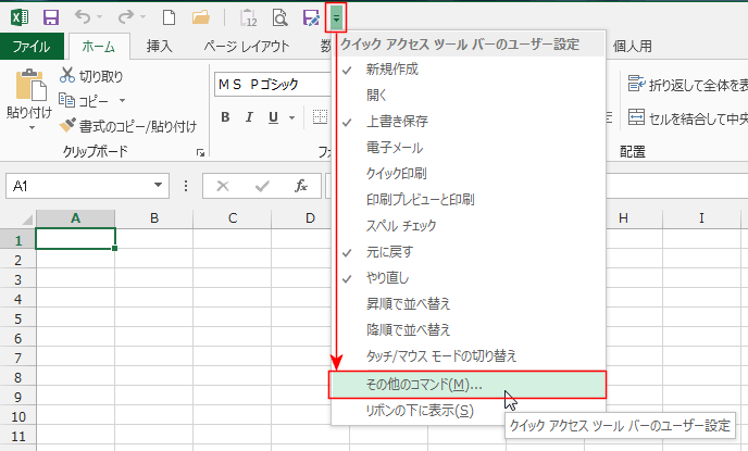 - クイックアクセスツールバーの[▼]ボタンをクリックして、[その他のコマンド]を実行します。