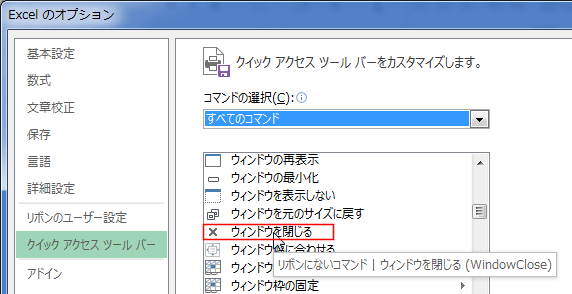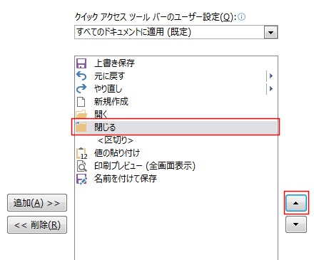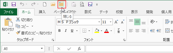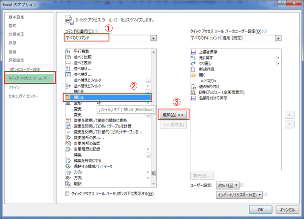 - ここでは、クイックアクセスツールバーへ[ファイルを閉じる]コマンドを登録してみます。