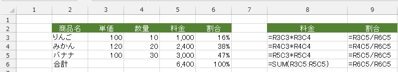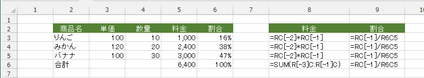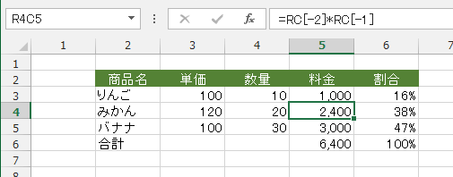 - 料金の計算式は =RC[-2]*RC[-1] となっています。