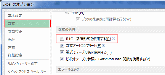 - [数式]を選択して、「R1C1参照形式を使用する」のチェックを外します。