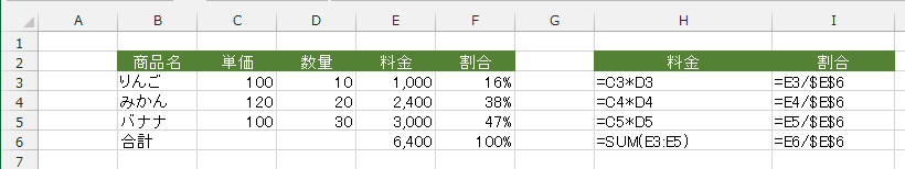 - 料金と割合の計算式を右の列にFORMULATEXT関数(Excel2013で追加された関数)を使って表示しています。