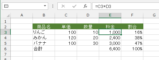 - 料金の計算式は =R3C3*R3*C4 となっています。
