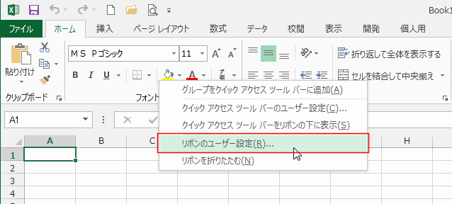 - リボンを右クリックして、右クリックメニューの「リボンのユーザー設定」を実行します。