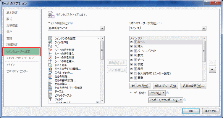 よねさんのExcelとWordの使い方|エクセル2013基本講座:目次|リボンとクイックアクセスツールバー|新しいタブ、新しいグループを作成する