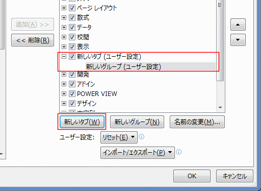 - 選択していた[表示]の下に「新しいタブ(ユーザー設定)」と「新しいグループ(ユーザー設定)」が作成されました。