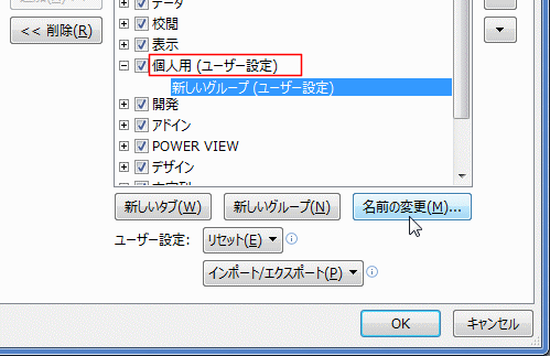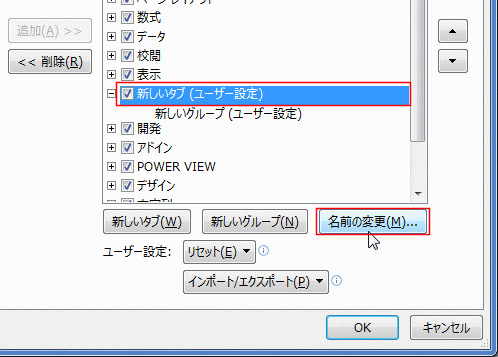 - 作成された「新しいタブ(ユーザー設定)」を選択して[名前の変更]ボタンをクリックします。