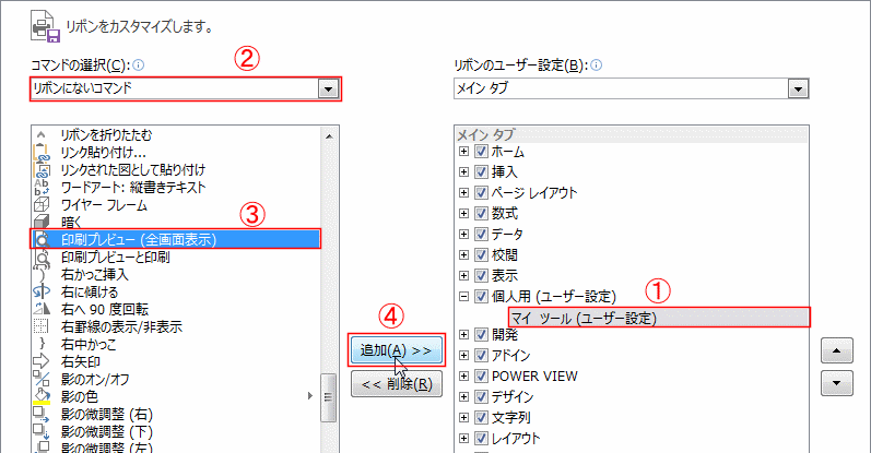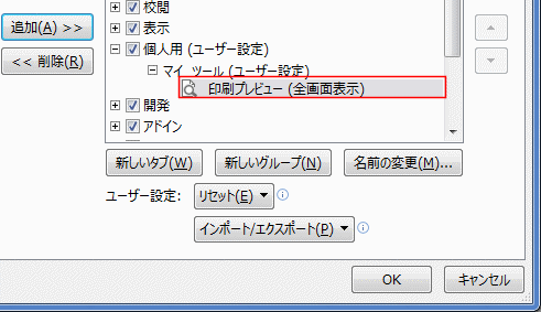 - [OK]ボタンをクリックして設定を反映すると、[個人用]タブの[マイツール]グループに「印刷プレビュー(全画面表示)」が作成されたのが確認できました。
