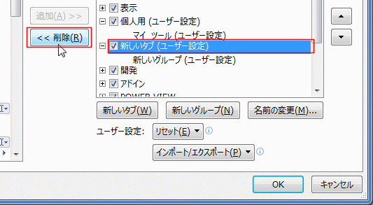 - ユーザー設定で新しいタブやグループを作成したけど、不要になった・・・という場合は削除することができます。