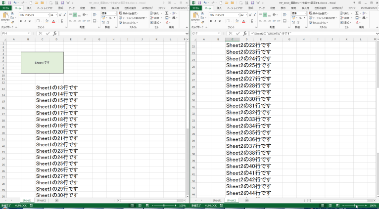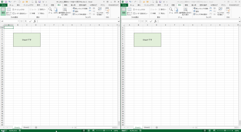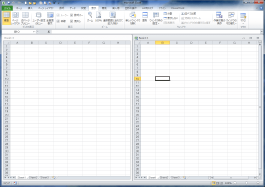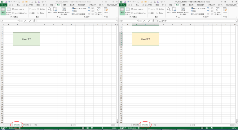 下図では左のウィンドウにSheet1が、右のウィンドウにSheet2が表示されています。