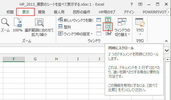- 2つのウィンドウを同時にスクロールして表示したいときは、[表示]タブの[同時にスクロール]をクリックしてオンにします。