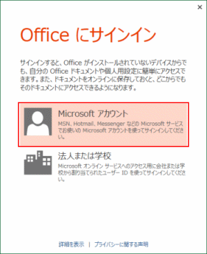 - Officeにサインインで「Microsoftアカウント」をクリックします。