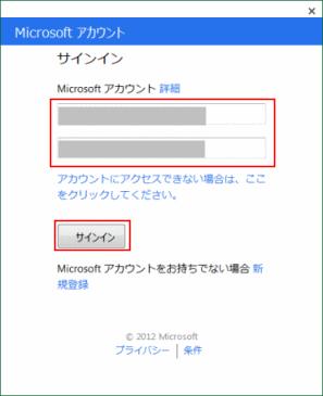 - MicrosoftアカウントのIDとパスワードを入力し、[サインイン]ボタンをクリックします。