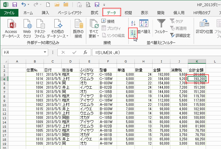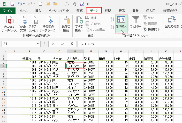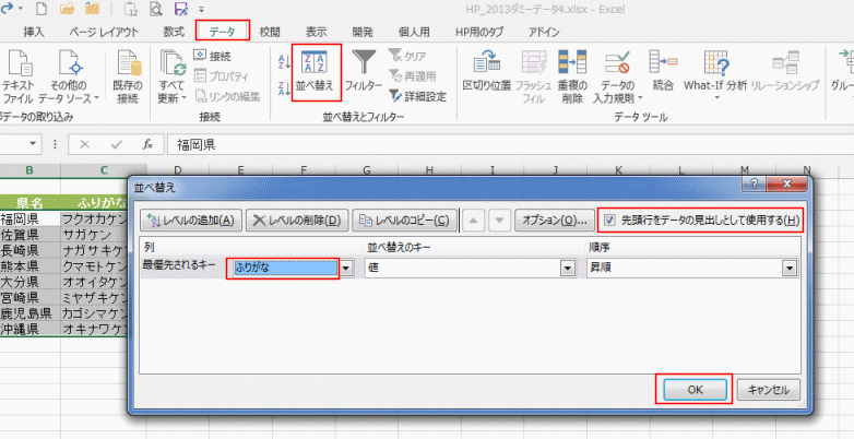 よねさんのExcelとWordの使い方|エクセル2013基本講座:目次|並べ替え|データを並べ替える