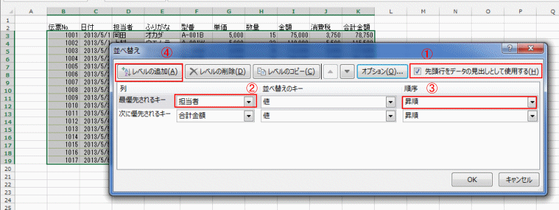 並べ替える基準(条件)が複数ある時は「レベルの追加」ボタンを使って並べ替えの条件を追加します。
