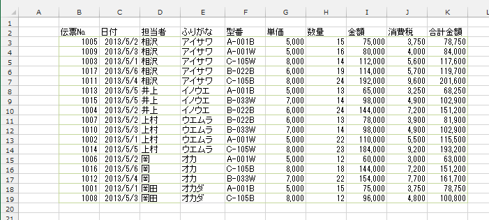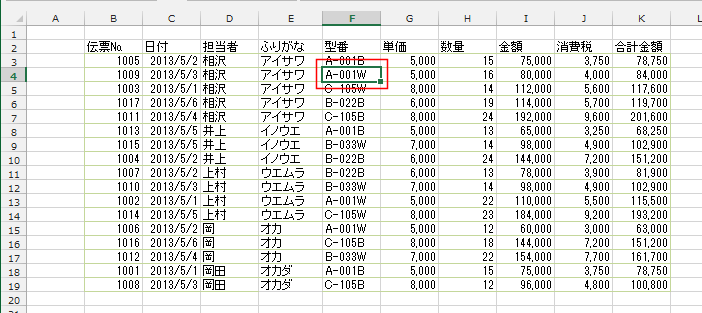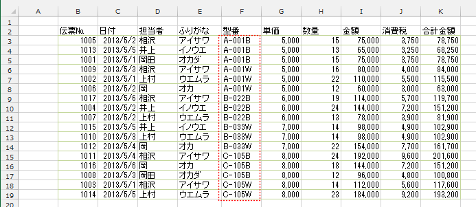 例えば、「型番」を基準に並べ替え、更に「型番」の中では「合計金額」が高い方から並べ替えたい・・・とします。