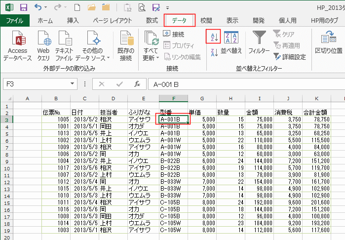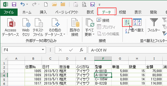 - 「型番」のセルを1つ選択して[昇順]で並べ替えます。