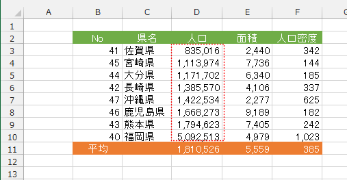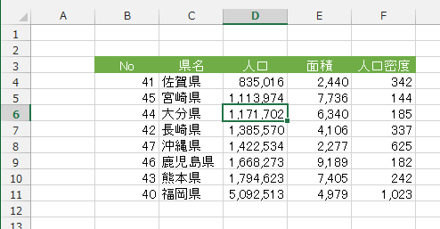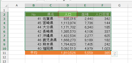 [Tab][Tab] と[Tab]キーを2回押して、D2セル[人口]をアクティブにしました。