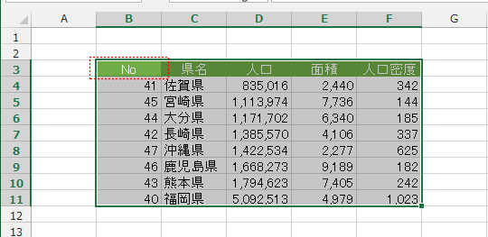 - 並べ替えの基準となる列に [Tab]キーを押して、アクティブセルを移動します。