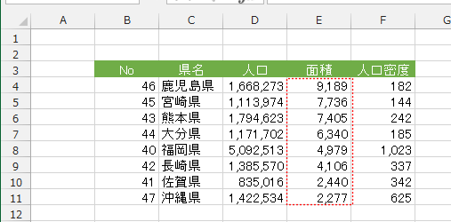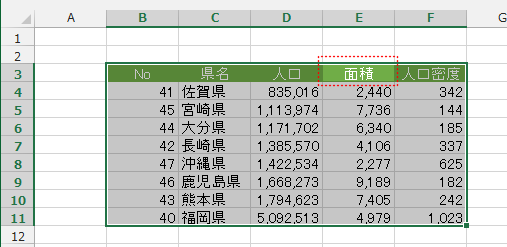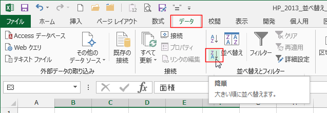 ここでは E列の面積のデータで並べ替えたいと思います。