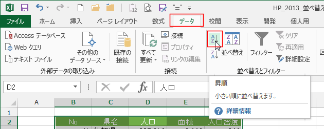 - [人口]の小さい値の順番にデータが並べ替えられました。