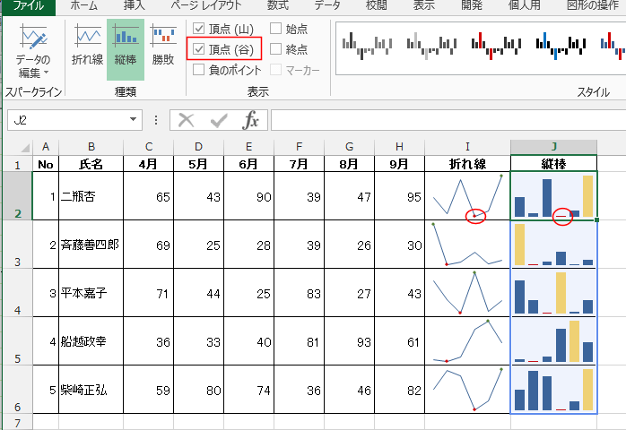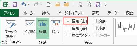 - 同様に、スパークラインツールの表示グループにある「頂点(谷)」にチェックを入れます。