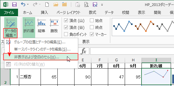 - スパークラインツールの「データの編集」→[非表示および空白セル]を実行します。