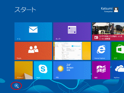 - 使用できるアプリケーションの一覧はスタート画面に表示される↓ボタンをクリックするか、画面下部を上へスワイプ(上へはじく、払う)ことで表示できます。