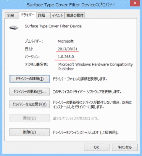 | 結論から申しますと、wndows8.1にアップデート後、type coverのアップデートにより、 FNロックができるようになりました。 以下に経緯と流れを記します。何かの参考にして頂ければ幸いです。 ------------------------------ 6月 ・国内版Surface Proを購入 ・type coverの更新を知り、何とか適用できないかと思い、色々作業をする内にドライバーを削除 ・再度、type coverを繋げばドライバーが落ちてくると期待するも無反応に終わる ・type coverを接続するとデバイスマネージャーのキーボードの項には、HIDキーボードデバイスが 2つ表示され、FNロック以外は通常通り使用できている (以後、type coverと疎遠のまま10月まで放置) 10月 ・サポートに連絡し、ドライバーを入れることができないか相談したところ、最終的には 「windows8.1にアップデートすることでファームウェアが一緒に入るかも知れない」と言われ アップデートをするもファームウェアは更新されない ・http://www.microsoft.com/en-us/download/details.aspx?id=38826 より、proのドライバー一式をダウンロードし、HIDキーボードデバイスのドライバーの更新を実施したところ Surface Type Cover Filter Devaiceが久しぶりに表示される ・Surface Type Cover Filter Devaiceのドライバーの更新を試みるも、既にwindows8.1のためか 最新版である旨が表示される(FNロックはできないまま) (ドライバーの日付は2012年12月だったと思います) ・デバイスマネージャーのファームウェアの項「Surface Pro UEFI」を削除し、WindowsUpdateを実行したところ、 ファームウェアの更新がある旨が表示され、更新を行う ・再起動後、FNロックができるようになる ------------------------------ 添付ファイルの通り、バージョンは8月21日の1.0.268.0となっておりますが、 FNロックができているので、概ね満足しております。 尚、この状態でtype coverのドライバーの更新を行っても最新版であると表示されます。 またtype coverは国内版で、キー配列も日本語のものです。 |