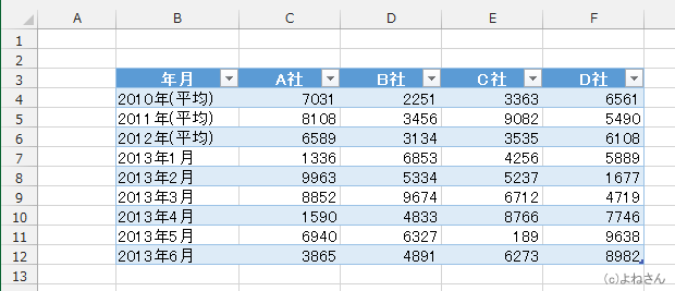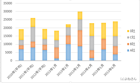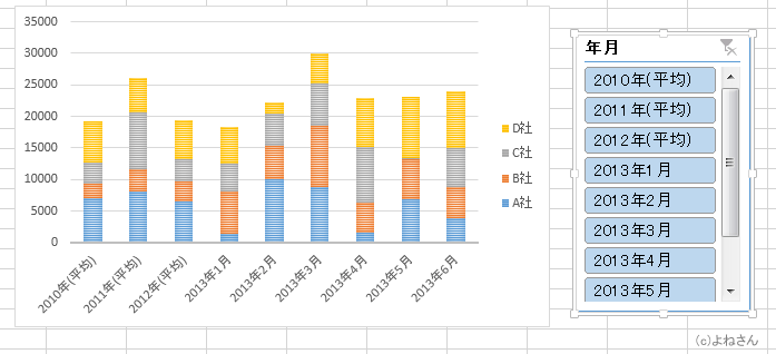 よねさんのExcelとWordの使い方|エクセル2013基本講座:目次|テーブル機能|エクセル2013基本講座:テーブルを利用した可変グラフ(積み上げ縦棒グラフ)