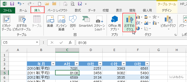 - Excel2013では「おすすめグラフ」という機能が新しく追加されましたので、この機能を使ってグラフを作成してみます。