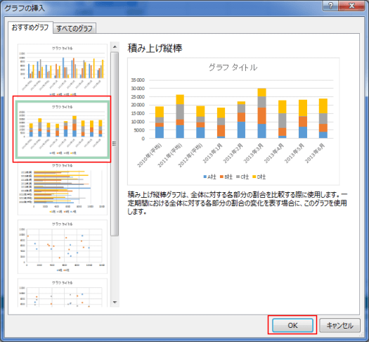 - 「おすすめグラフ」タブに積み上げ縦棒グラフが表示されましたので、選択して[OK]ボタンをクリックします。