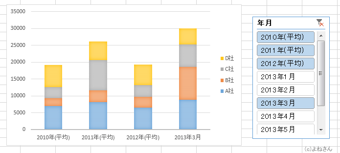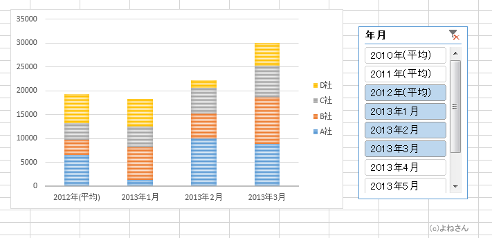 また、データの追加でグラフまで自動で変更されるのが困る・・・といったケースではスライサーを使ってデータを絞り込み、グラフに表示するデータを制限することができます。