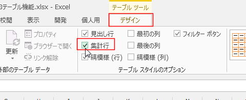 [テーブル スタイルのオプション]グループにある[集計行]をクリックしてチェックを入れます。