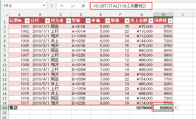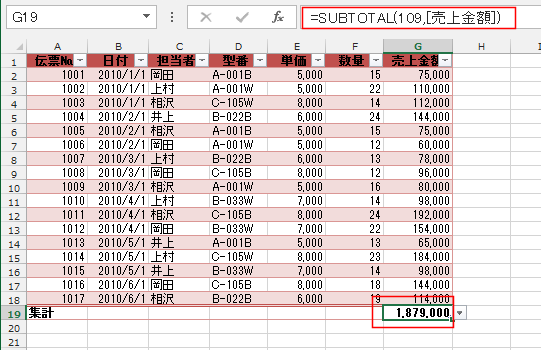 売り上げの箇所にはSUBTOTAL関数で合計が表示されました。