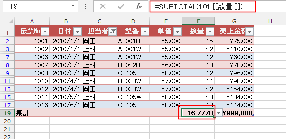 - SUBTOTAL関数で数式が入力され、表示データの平均値が計算されました。