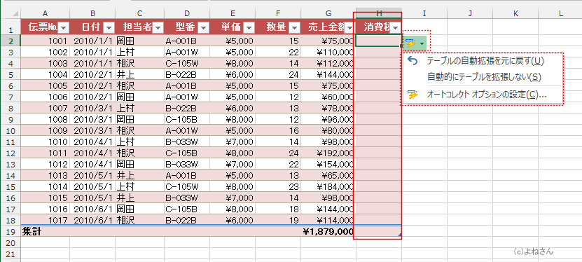 - 入力したセルに「オートコレクトのオプション」が表示されますので、この自動拡張はオートコレクトの機能で働いているのが分かります。