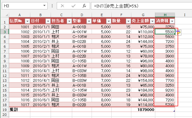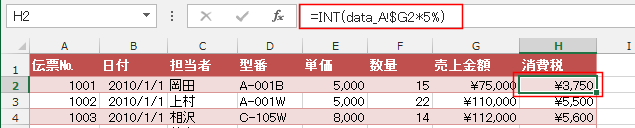 - H2セルの =INT([@売上金額]*5%) は =INT(data_A!$G2*5%) となっています。