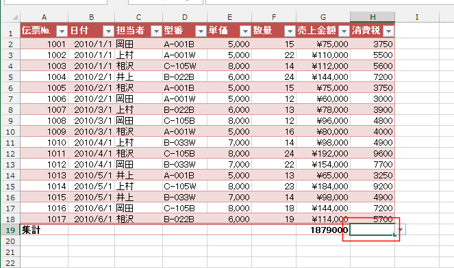 - 集計行のセルH19を選択します。
