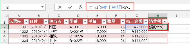 「=int(」を入力して、G2セルをクリックすると、[@売上金額]と構造化参照の形で入力されました。