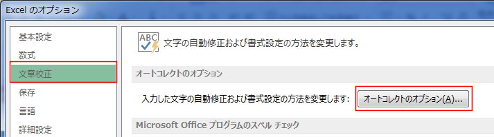 - [文書校正]を選択し、[オートコレクトのオプション]ボタンをクリックします。