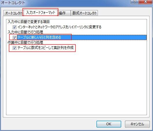 - テーブルでの列の追加などの自動拡張機能はオートコレクトの設定です。