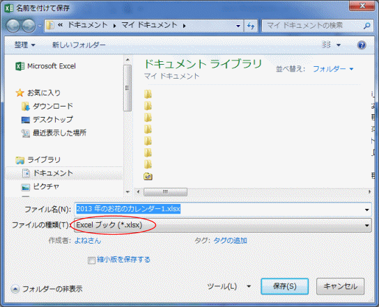 - 修正などした後で上書き保存をすると、ファイルの種類は「Excelブック(*.xlsx)」となります。