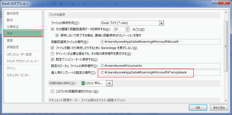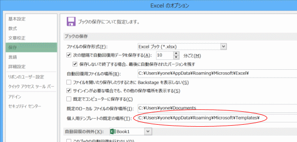 - 問題はエクスプローラーや保存ダイアログボックスで保存先が「C\ユーザー\・・・」と表示されていますが、入力するときは「C:\Users\(ユーザー名)\AppData\Roaming\Microsoft\Templates\」としました。