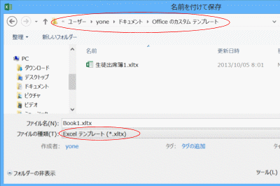 ファイルの種類で「Excelテンプレート(*.xltx)」を選択します。