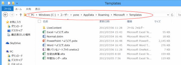 - Windows7の場合は「C:\Users\ユーザー名\AppData\Roaming\Microsoft\Templates\」となっています。