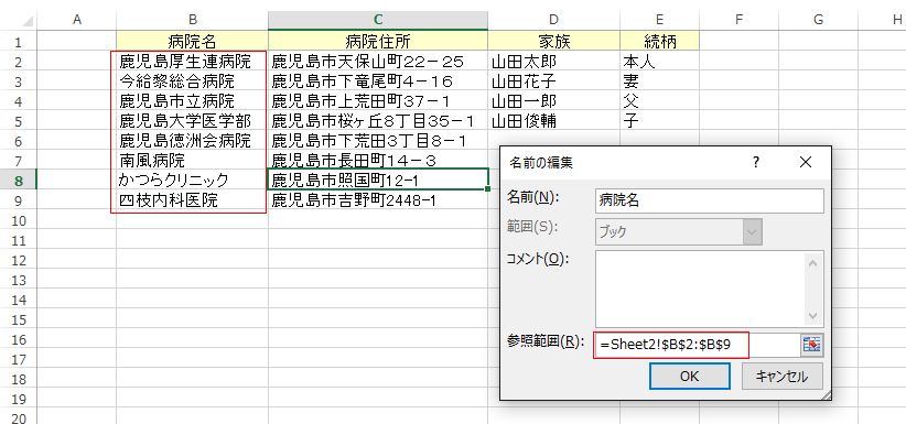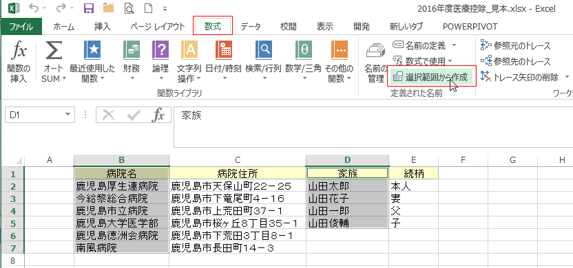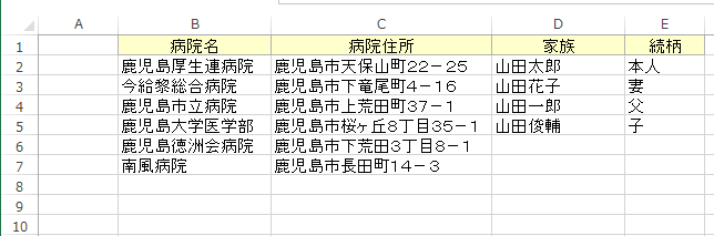 - 病院名と家族のセルを選択します。