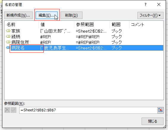 - 名前の「病院名」を選択して、[編集]ボタンをクリックします。